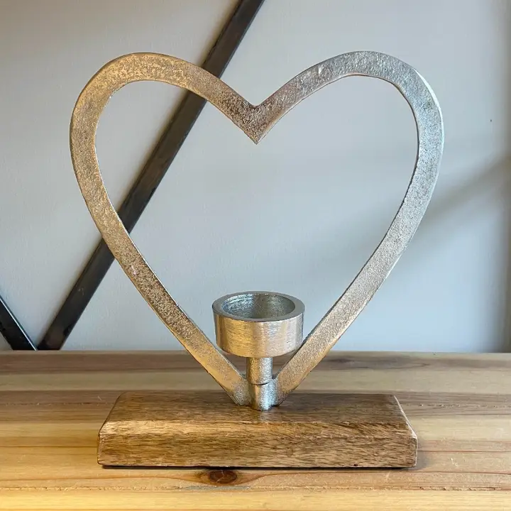 Sure to bring a delightful country charm feel to any home space, an aluminium Heart on wood base, complete with an added T-light holder. Perfect for providing a cosy and comforting glow to any space of the home or to give to a loved one.