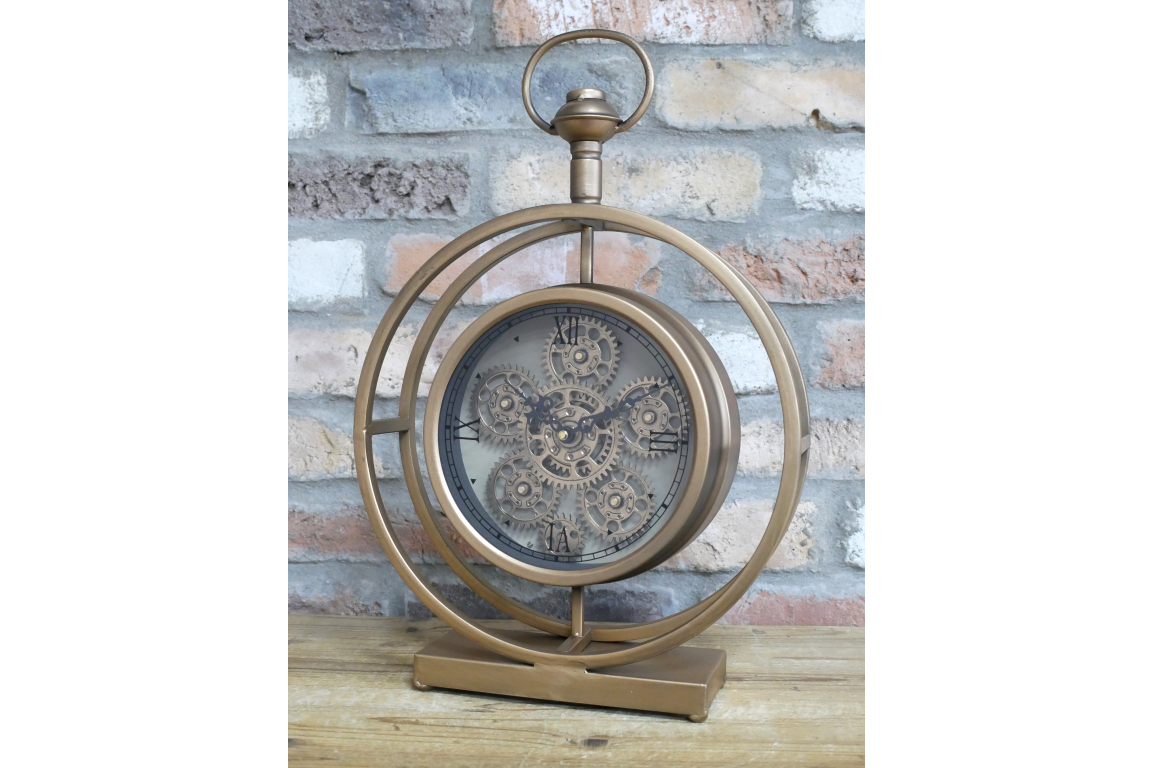 Antique Gold finish clock with moving cogs, designed for desks, shelves or a mantelpiece.