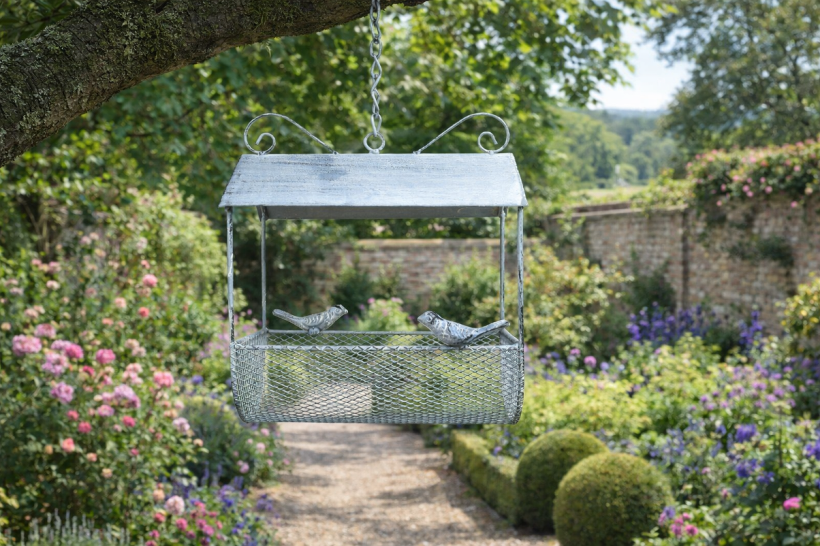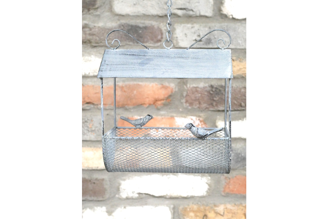 A beautiful metal hanging birdfeeder with a rustic French vintage chic design with two decorative bird figures. This birdfeeder has a mesh tray and is suitable for holding nuts or seeds.