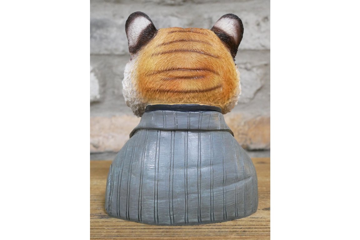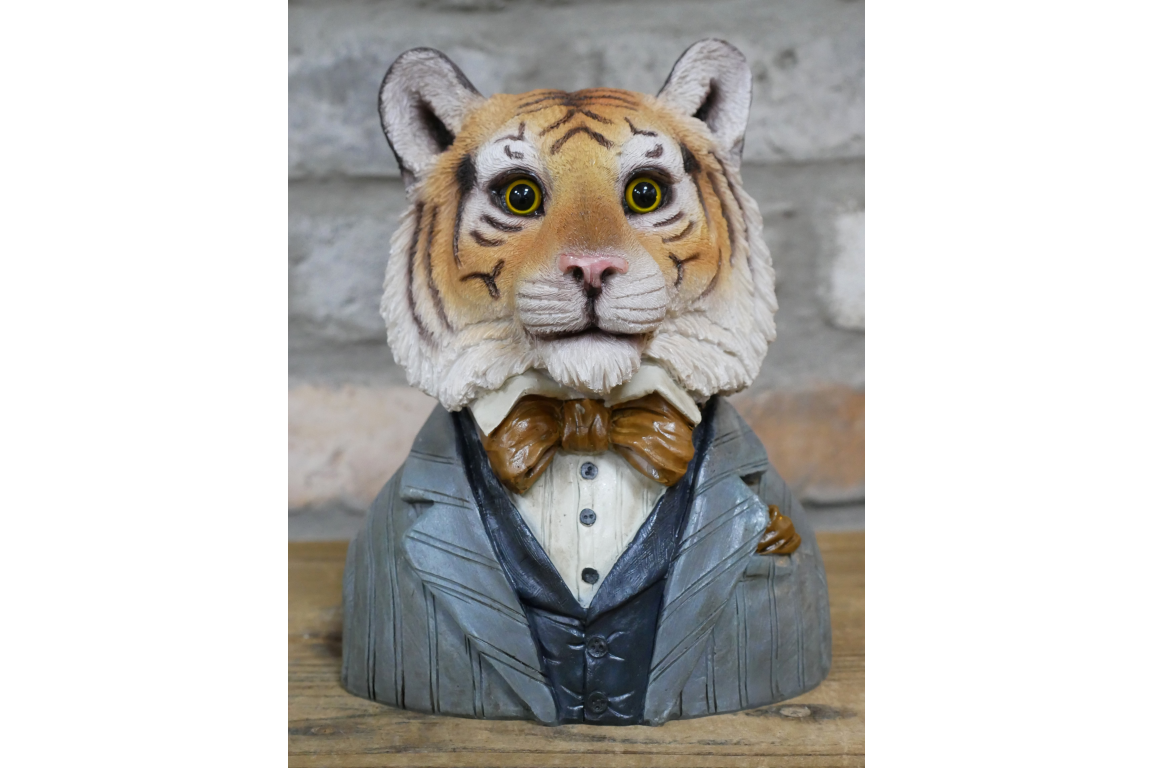 A small Gentleman Tiger Bust dressed in a smart blue jacket, navy waistcoat, white shirt & bow tie. This decorative piece is designed to add a touch of fun to any home. Made from resin.